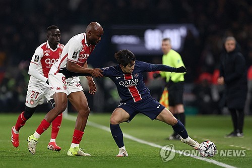 모나코전에서 공을 간수하려는 PSG 이강인(가운데) |