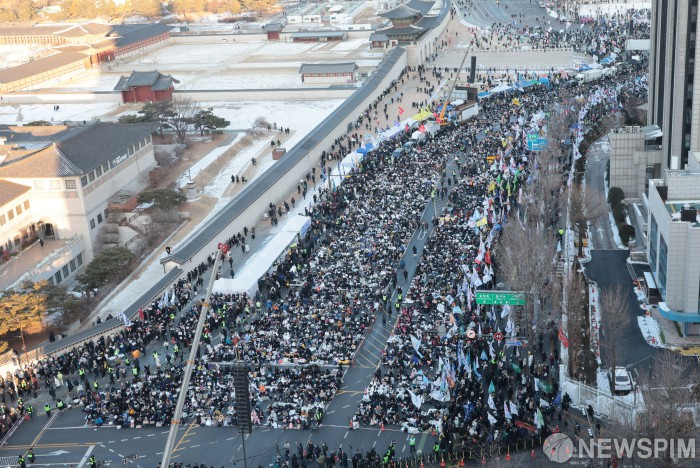 [서울=뉴스핌] 이길동 기자 = 서울 체감 온도가 영하 18도까지 떨어지면서 매서운 한파가 이어진 8일 오후 서울 종로구 경복궁 인근에서 윤석열 즉각퇴진 사회대개혁 비상행동 주최 제10차 범시민대행진이 열리고 있다.2025.0208 gdlee@newspim.com