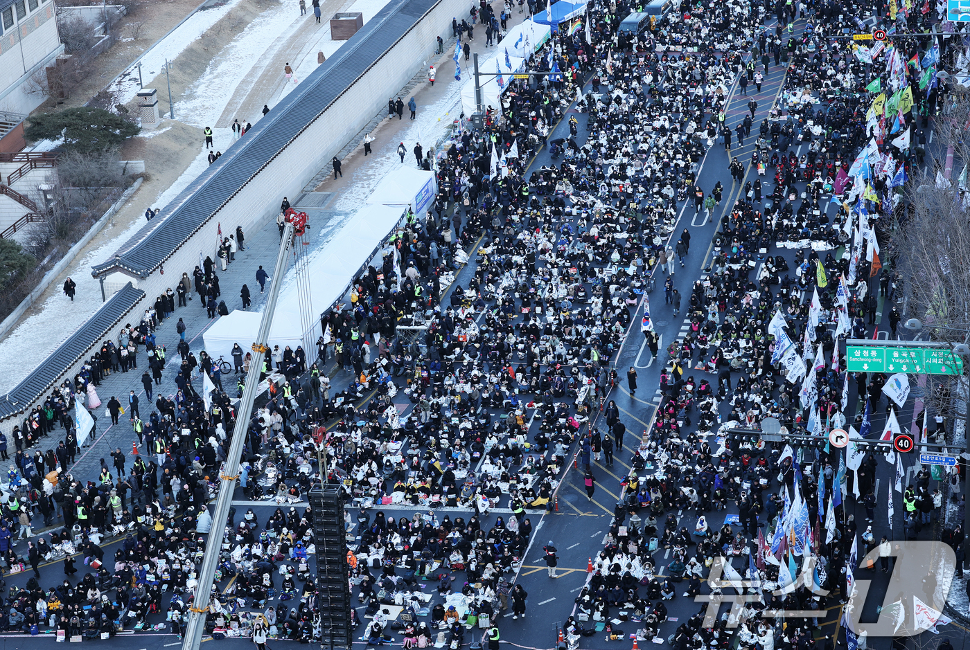 (서울=뉴스1) 오대일 기자 = 8일 오후 서울 종로구 경복궁역 일대에서 열린 윤석열 대통령 즉각 퇴진 사회대개혁 비상행동 주최 10차 범시민대행진 집회에서 참가자들이 윤 대통령의 파면을 촉구하고 있다. 2025.2.8/뉴스1