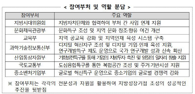 문화체육관광부는 지방시대위원회를 비롯해 교육부, 과학기술정보통신부, 산업통상자원부, 국토교통부, 중소벤처기업부와 함께 업무협약을 체결하고, 지방성장거점 조성 및 활성화를 위해 협력하기로 했다고 11일 밝혔다.