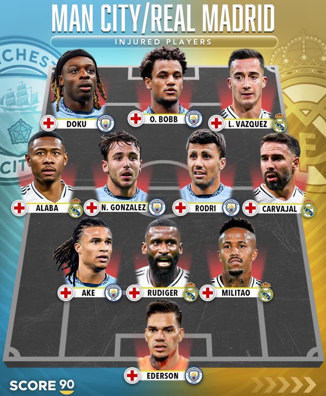 축구매체 '스코어 90'은 두 팀의 부상자로 베스트 일레븐을 구성했다. 어느 팀이 더 유리하다고 볼 수 없을 정도로 부상자가 많아 펩 과르디올라 감독, 카를로 안첼로티 감독 모두 고민을 겪을 것이다.
