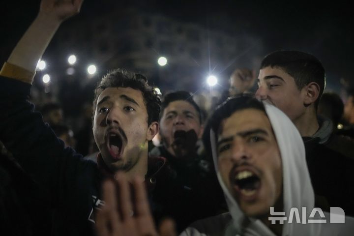 [홈스=AP/뉴시스] 시리아 청년들이 1월 2일 홈스에서 친아사드 민병대 수색 작전을 마친 과도정부 보안군 대원들이 공중에 총을 쏘며 자축하는 모습을 보면서 환호하고 있다. 반군으로 구성된 과도정부 보안군은 징병제를 폐지하고 자원 입대자를 모집, 큰 호응을 받고 있다고 알샤라 대통령이 2월 10일 밝혔다. 2025. 02. 11. |