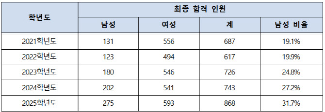 지난 5년간 공립학교 중등학교 교사 합격자 중 남성이 차지하는 비율은 2021학년도 19.1%에서 매년 꾸준히 상승했다. 2022학년도 19.9%, 2023학년도 24.8%, 2024학년도 27.2%를 기록했으며, 올해인 2025학년도에는 처음으로 30%를 넘어섰다. 이는 2021학년도와 비교해 12.6%포인트 증가한 수치다.