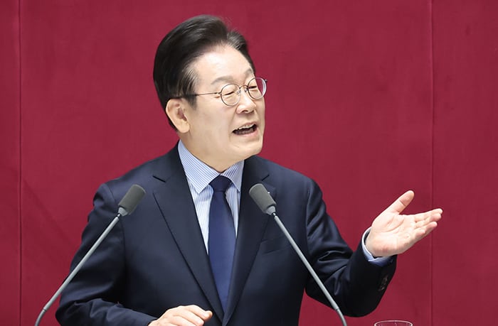 항의하는 與 향해 “품격 지켜달라” - 이재명 더불어민주당 대표가 10일 오전 국회에서 교섭단체 대표 연설을 하던 중 내용에 항의하는 국민의힘 의원들을 향해 “품격을 지켜달라”고 말하고 있다. /연합뉴스 |