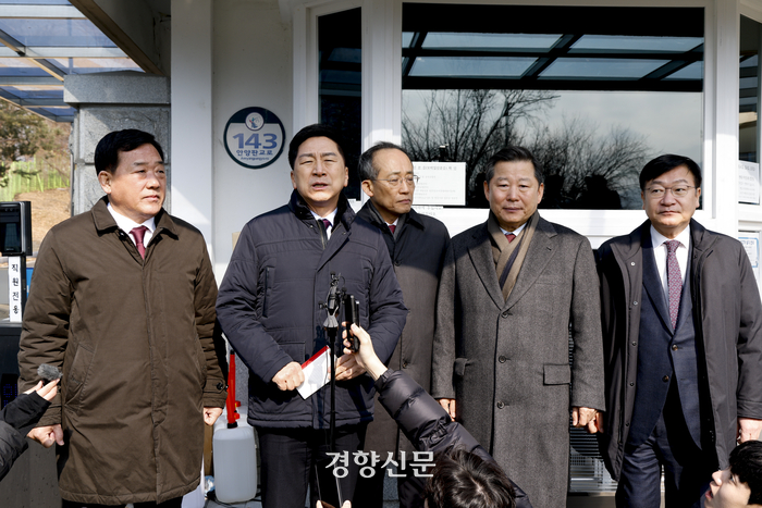김기현 추경호 이철규 박성민 등 국민의힘 의원들이 10일 경기 의왕시 서울구치소에서 윤석열 대통령 접견을 마치고 취재진 질문에 답하고 있다. 문재원 기자 |