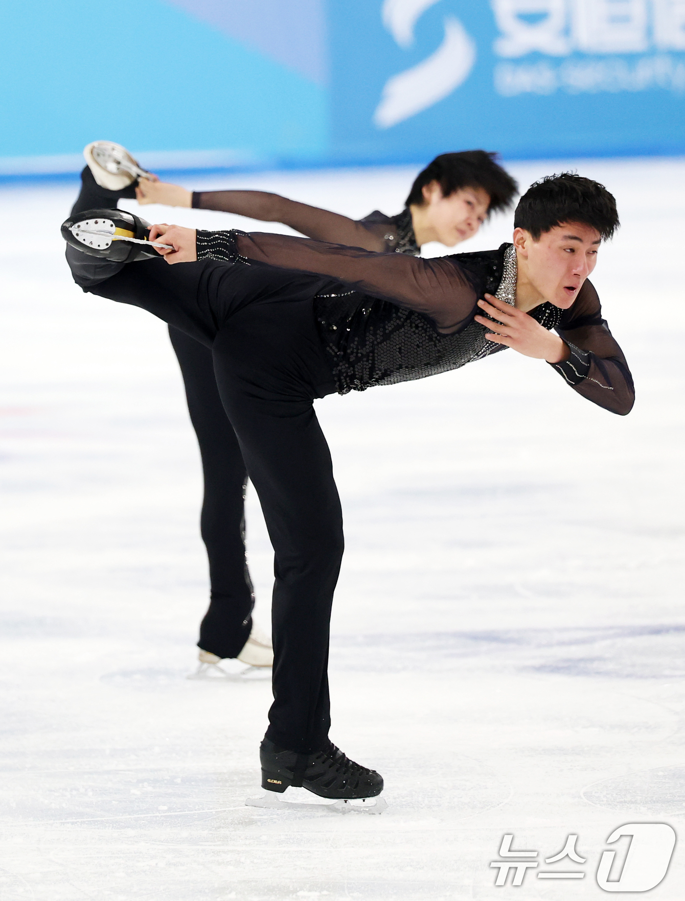 (하얼빈(중국)=뉴스1) 이승배 기자 = 하얼빈 동계아시안게임에 출전하는 북한 피겨 페어 렴대옥, 한금철이 11일(현지시간) 중국 헤이룽장성 하얼빈 빙상훈련센터 다목적홀에서 훈련하고 있다. 2025.2.11/뉴스1