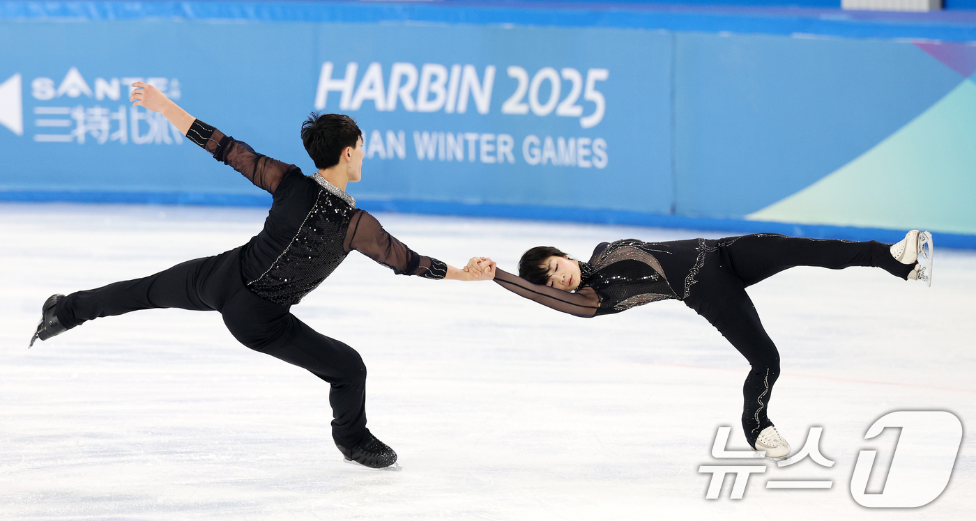(하얼빈(중국)=뉴스1) 이승배 기자 = 하얼빈 동계아시안게임에 출전하는 북한 피겨 페어 렴대옥, 한금철이 11일(현지시간) 중국 헤이룽장성 하얼빈 빙상훈련센터 다목적홀에서 훈련하고 있다. 2025.2.11/뉴스1