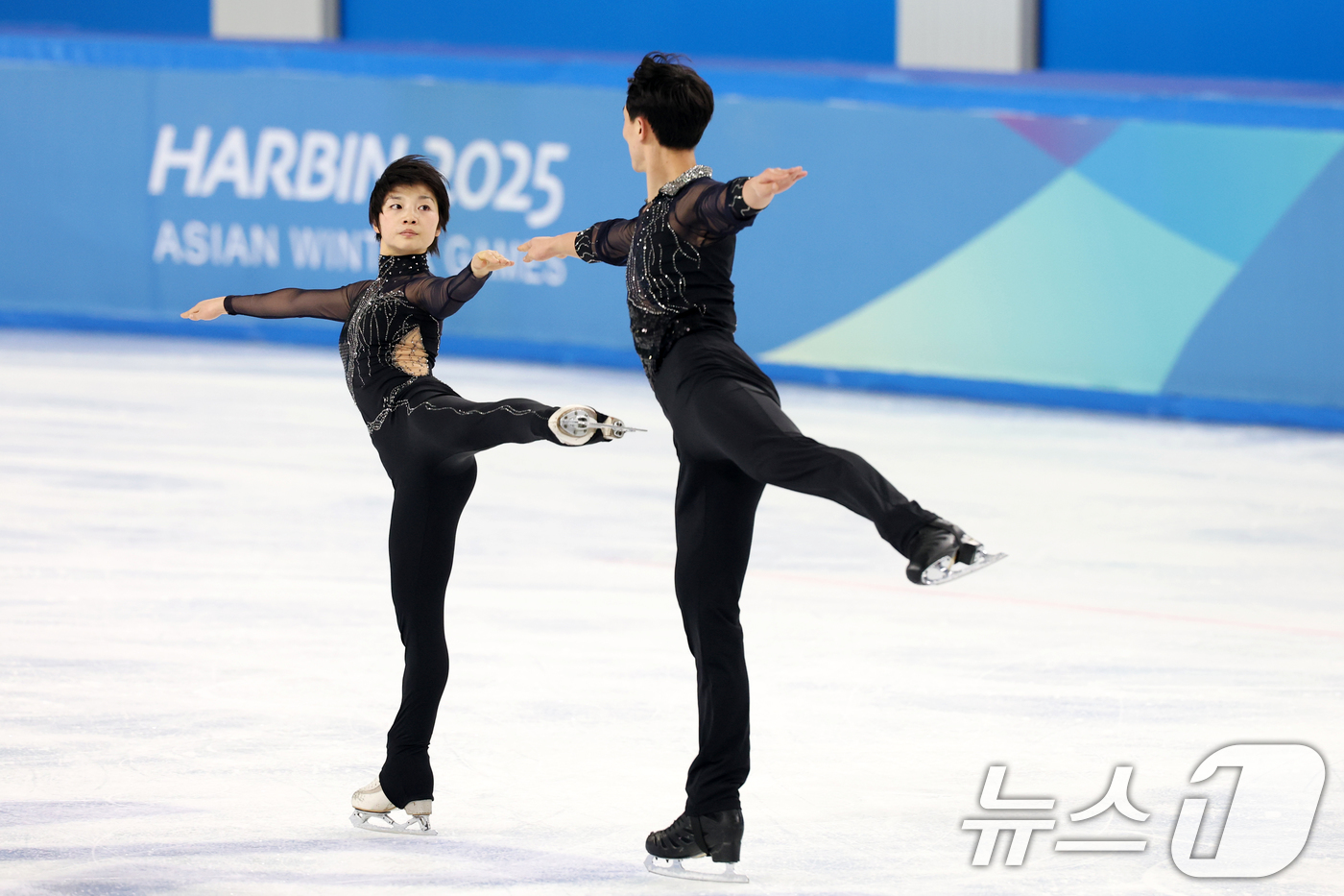 (하얼빈(중국)=뉴스1) 이승배 기자 = 하얼빈 동계아시안게임에 출전하는 북한 피겨 페어 렴대옥, 한금철이 11일(현지시간) 중국 헤이룽장성 하얼빈 빙상훈련센터 다목적홀에서 훈련하고 있다. 2025.2.11/뉴스1