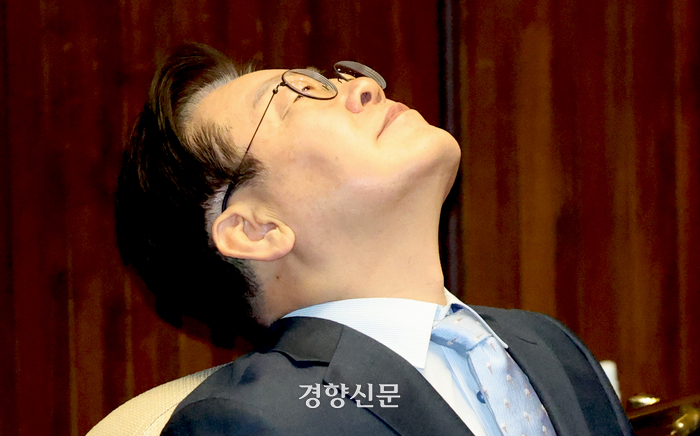 이재명 더불어민주당 대표가 11일 국회 본회의에서 권성동 국민의힘 원내대표의 교섭단체 대표 연설을 들으며 천정을 보고 있다. 박민규 선임기자 |