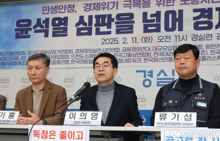 [서울=뉴스핌] 양윤모 기자 = 경실련이 11일 오전 서울 종로구 경실련 강당에서 '민생 안정, 경제 위기 극복을 위한 공동선언 기자회견'을 개최했다. 경실련은 양극화와 불평등을 확산하는 거대 양당의 경제정책을 규탄하고, ‘윤석열 심판을 넘어 경제민주화로!’를 주제로 각계 시민사회단체가 참여했다. 행사에는 김은정 참여연대 협동사무처장, 박기홍 한국중소상인자영업자총연합회 회장, 이의영 경실련 공동대표(군산대 경제학과 교수), 류기섭 한국노총 사무총장, 김경민 YMCA 사무총장, 김남주 민변 민생경제위원장(변호사), 권오인 경실련 경제정책팀 국장이 참석했다. 2025.02.11 yym58@newspim.com |