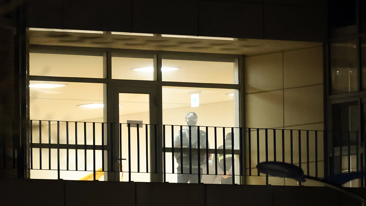 ▲ 사건이 발생한 초등학교 2층 시청각실에서 현장검증하고 있는 경찰