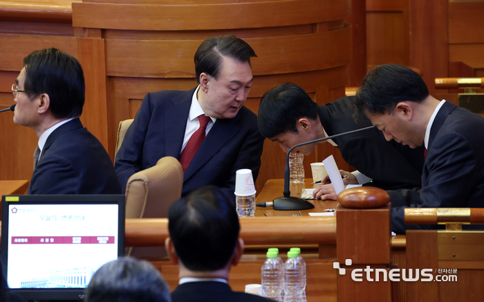 윤석열 대통령이 11일 서울 종로구 헌법재판소에서 열린 탄핵심판 7차 변론기일에 출석해 변호인과 대화하고 있다. /2025.02.11 사진공동취재단