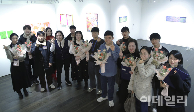 곽재선문화재단이 할리스와 함께 진행한 ‘제3회 아트공모전’에서 수상한 작가들이 지난 6일 서울 중구 통일로 KG타워에서 연 시상식 이후 자신의 작품들 앞에 모였다. 올해 을사년 ‘뱀’을 테마로 한 ‘제3회 아트공모전’은 15명 작가의 수상작을 선정했다. KG타워 갤러리선에서는 수상작을 비롯해 주요 참여작 40여 점을 내놓고 ‘복 주는 화사전: 스네이크 센스’를 28일까지 이어간다(사진=이영훈 기자). |