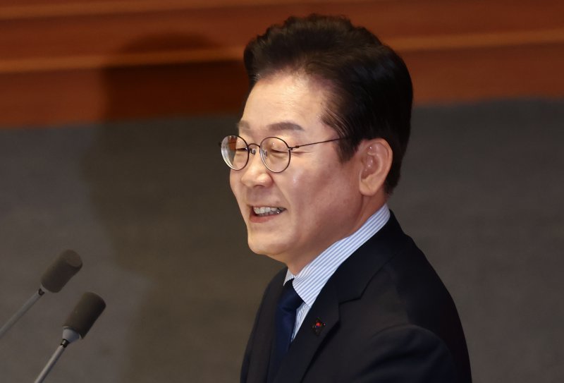 이재명 더불어민주당 대표가 10일 오전 서울 여의도 국회에서 열린 본회의에서 교섭단체 대표연설을 하던 도중 미소를 보이고 있다. 2025.2.10/뉴스1 ⓒ News1 김민지 기자 /사진=뉴스1 |
