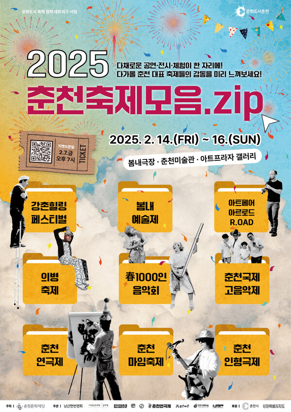 (문화뉴스 김도형 기자) 춘천문화재단이 2월 14일(금)부터 16일(일)까지 춘천예술마당(봄내극장, 춘천미술관, 아트프라자 갤러리)에서 '2025춘천축제모음.zip'을 개최한다.