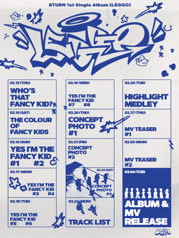 공개된 스케줄러에 따르면 오는 3월 4일 발매되는 8TURN의 새 싱글은 'LEGGO(레고)'이다. 8TURN은 13일 'WHO'S THAT FANCY KID', 16일부터 19일까지 'YES I'M THE FANCY KID'란 타이틀의 콘텐츠를 차례로 공개한다.