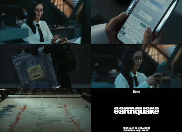 티저 영상 속 지수는 긱시크 비주얼의 커리어 우먼으로 분해 색다른 매력을 발산했다. 그때 연인에게 메시지가 도착했고, 공간 전체에 진동이 느껴지며 휴대폰이 증거품으로 압수되는 장면이 속도감 있게 펼쳐져 'earthquake' 뮤직비디오 본편에 대한 궁금증을 자극한다. 거짓말 탐지기가 작동하는 모션은 지수의 컴백일을 알린 커밍순 콘텐츠를 연상시킨다.