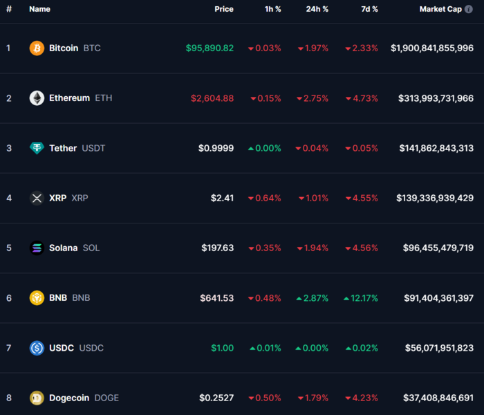 이더리움은 2.75% 내린 2604.88달러에 거래되고 있다. XRP, 솔라나는 각각 1.01%, 1.94% 하락한 2.41달러, 197.63달러를 기록하고 있다.
