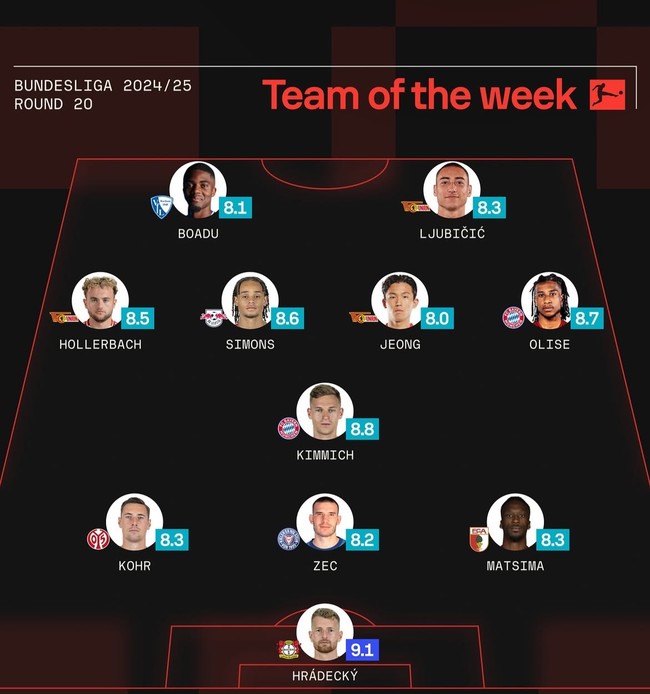 분데스리가 이주의 팀에 포함됐다. 정우영은 류비치치, 홀러바흐 등 동료들과 같이 이름을 올렸고 사비 시몬스, 마이클 올리세, 조슈아 키미히, 루카스 흐라데키 등도 위치했다.