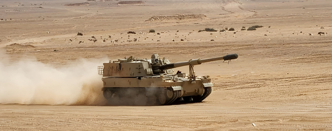중동 사막을 달리고 있는 K9 자주포. 한화에어로스페이스 |