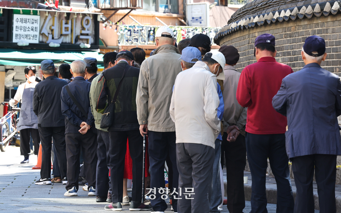 서울 종로구 탑골공원 앞에서 어르신들이 무료급식을 받기 위해 줄을 서 있다. 성동훈 기자 |