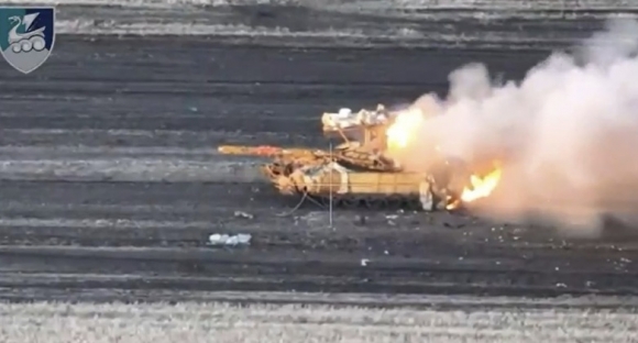재블린 대전차 유도미사일(ATGM)에 맞아 파괴되는 러시아군 전차. 우크라이나 국방부 제공 |