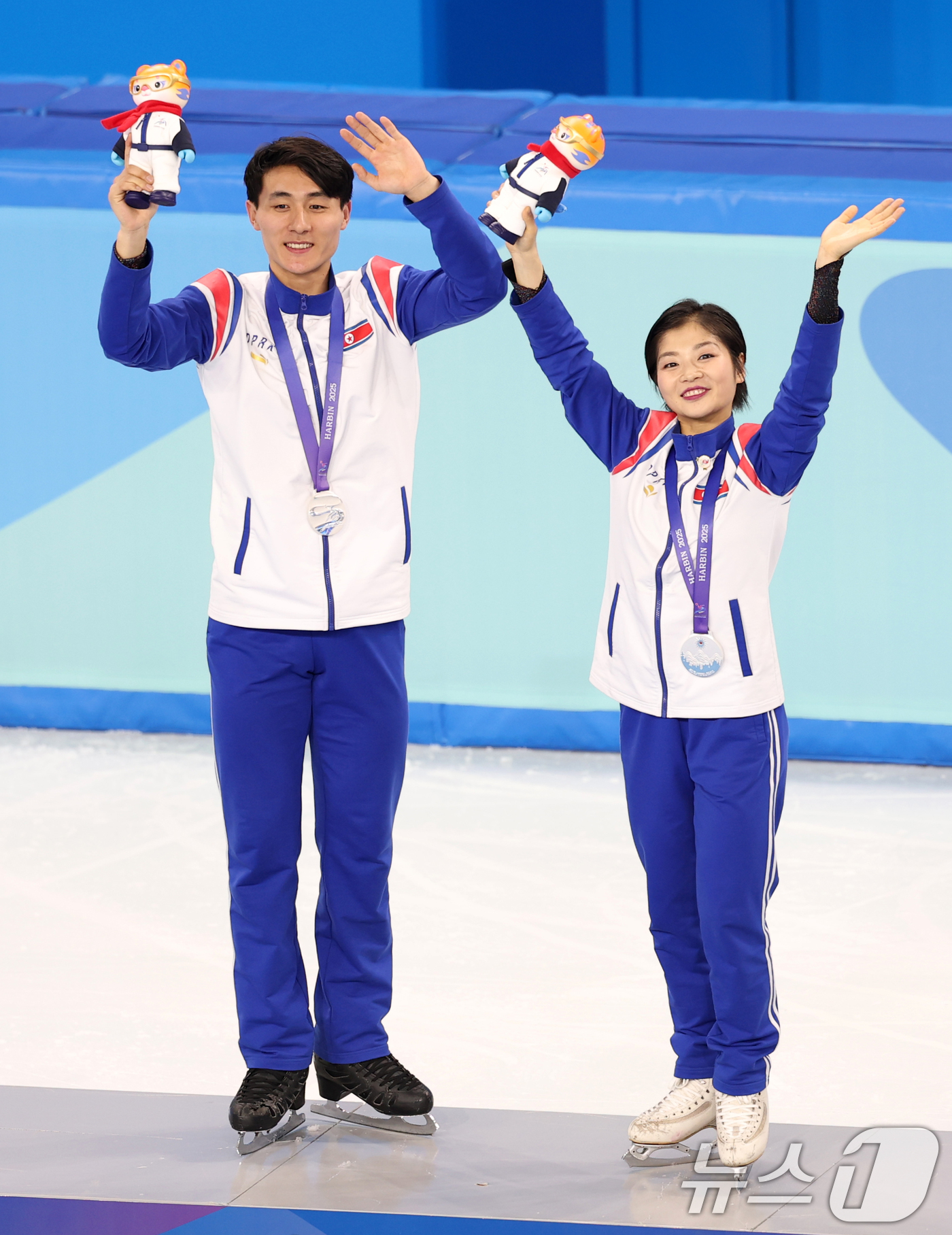 (하얼빈(중국)=뉴스1) 이승배 기자 = 하얼빈 동계아시안게임 피겨 페어에서 은메달을 차지한 북한 렴대옥·한금철이 12일 중국 헤이룽장성 하얼빈 빙상훈련센터 다목적홀에서 열린 시상식에서 손을 흔들고 있다. 2025.2.12/뉴스1