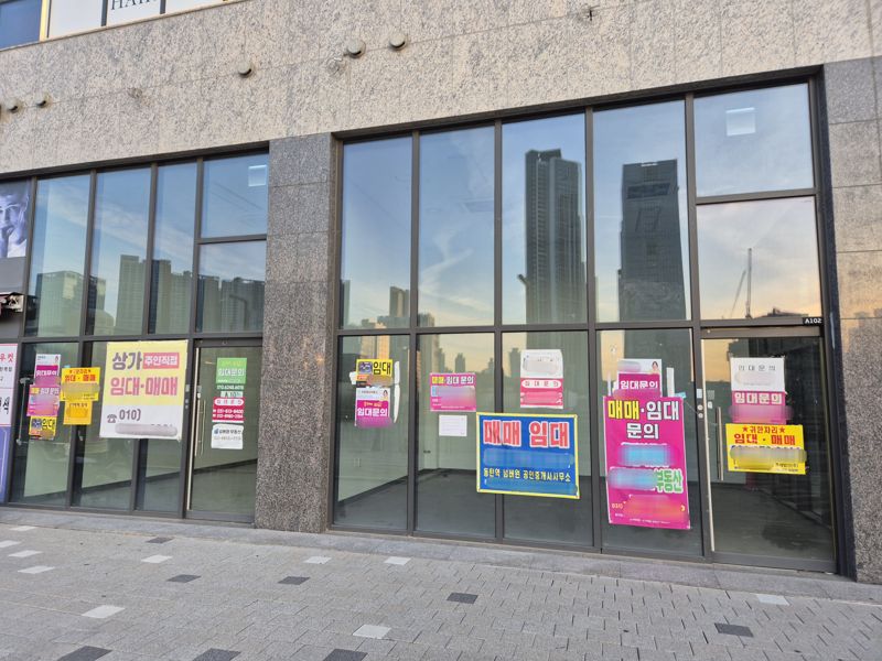 공실 상태인 동탄신도시의 한 1층 상가에 매매·임대 홍보물이 붙어있다. 사진=전민경 기자 |