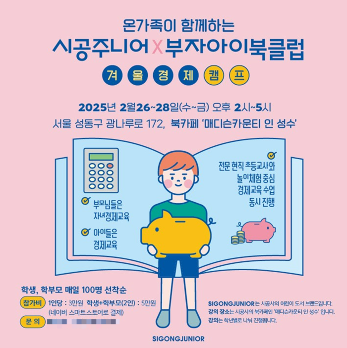 한편, 이번 경제캠프는 시공사의 네이버 스마트 스토어에서 날짜별, 학년별로 접수할 수 있고 보다 자세한 사항은 이메일이나 전화로 문의하면 된다.