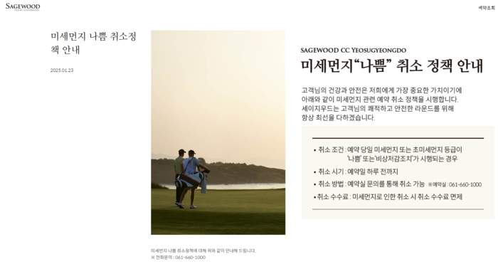 미래에셋 세이지우드(홍천, 여수경도)CC가 미세먼지로 인한 예약 취소 정책을 시행하고 있다고 13일 밝혔다.