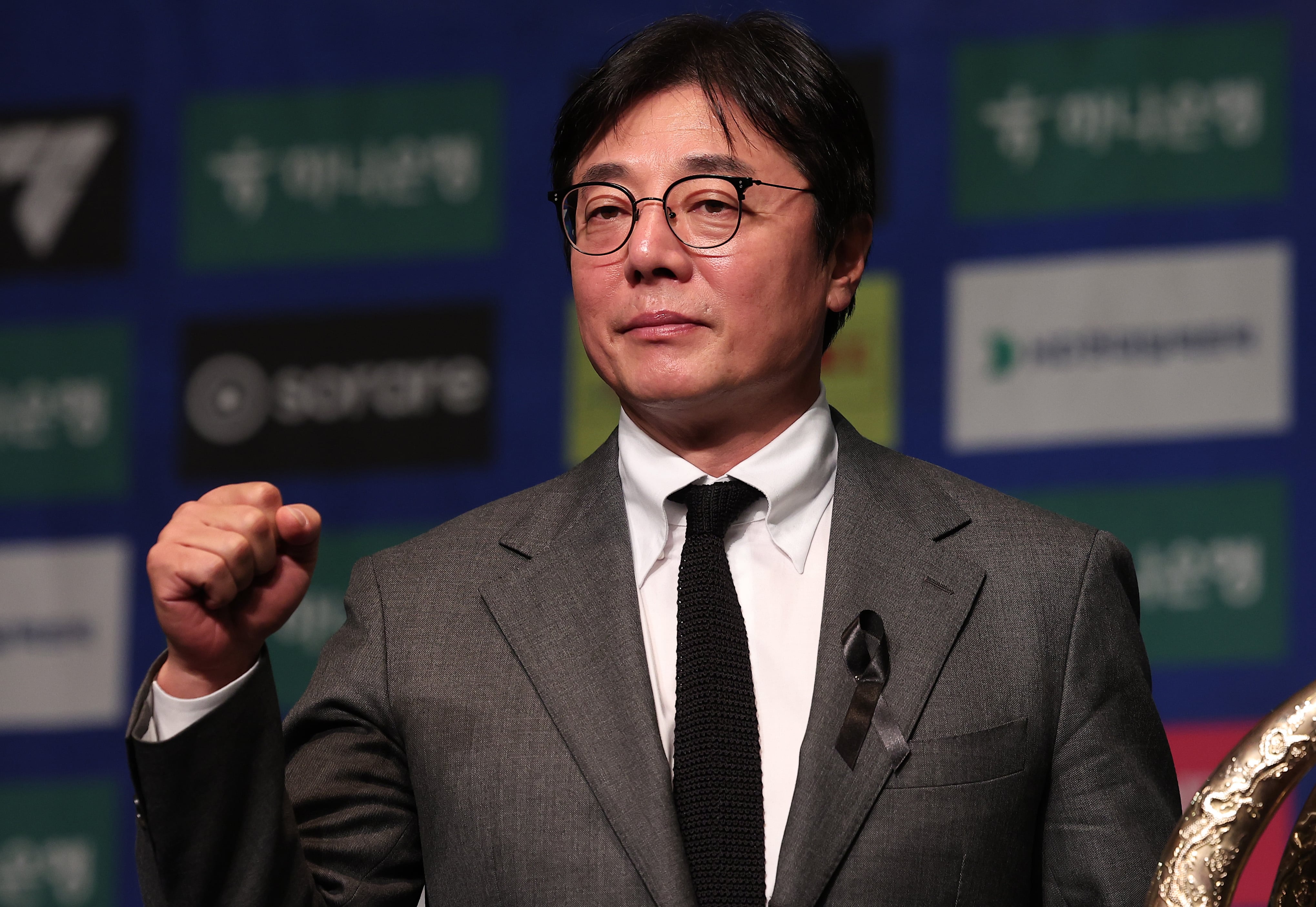 13일 2025시즌 K리그1 개막 미디어데이에 참석한 대전 황선홍 감독. 대전 팬이었던 김하늘양을 추모하는 의미로 검은 리본을 달았다. /뉴스1 |