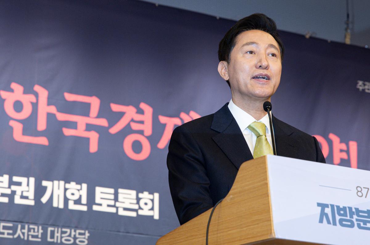 오세훈 서울시장이 12일 오전 서울 여의도 국회 도서관 대강당에서 서울특별시 ·서울연구원 주최로 열린 87체제 극복을 위한 지방분권 개헌 토론회에서 개회사를 하고 있다. 2025.2.12/뉴스1 |
