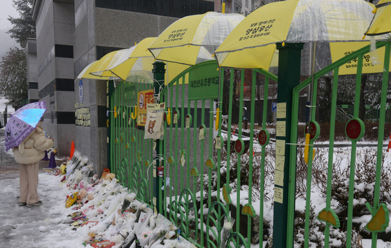 12일 대전 초등학생 피살사건이 발생한 대전 서구의 한 초등학교 정문에 추모객들이 놓고 간 국화과 편지 위에 우산이 설치돼 있다. 뉴스1 |