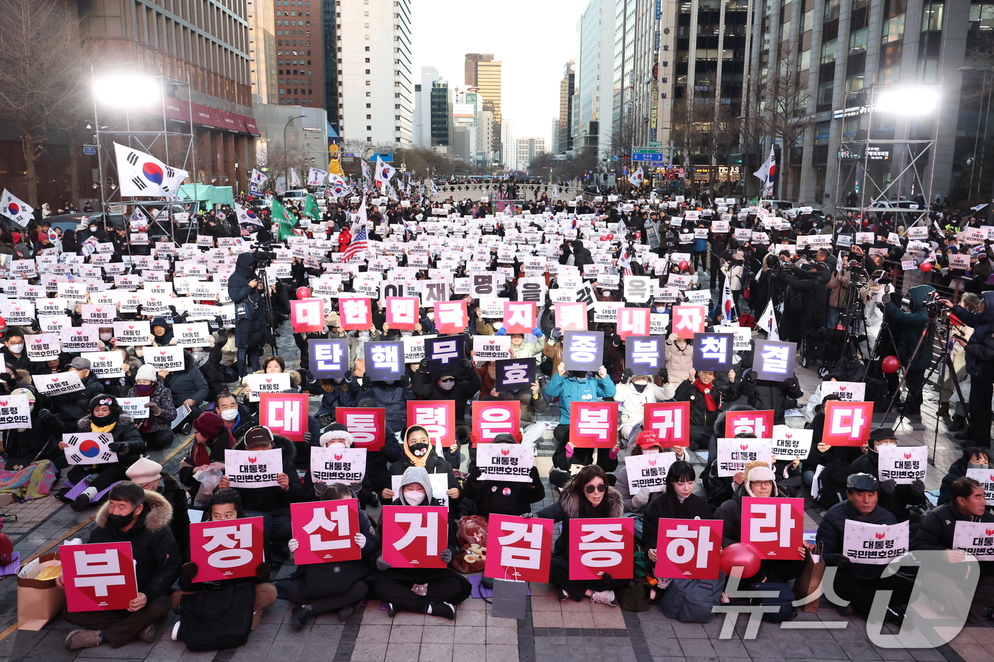 (서울=뉴스1) 민경석 기자 = 13일 오후 서울 청계광장에서 열린 '윤석열 대통령 국민변호인단 출범식'에서 참석자들이 구호를 외치고 있다. 2025.2.13/뉴스1