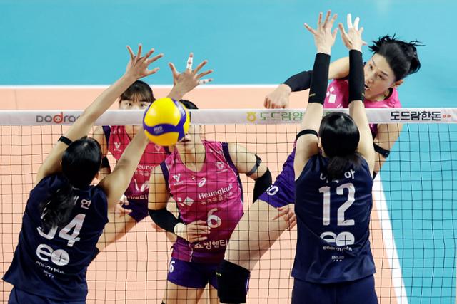 흥국생명 김연경(맨 오른쪽)이 13일 인천 삼산월드체육관에서 열린 GS칼텍스와 홈경기에서 스파이크를 날리고 있다. 뉴시스 |