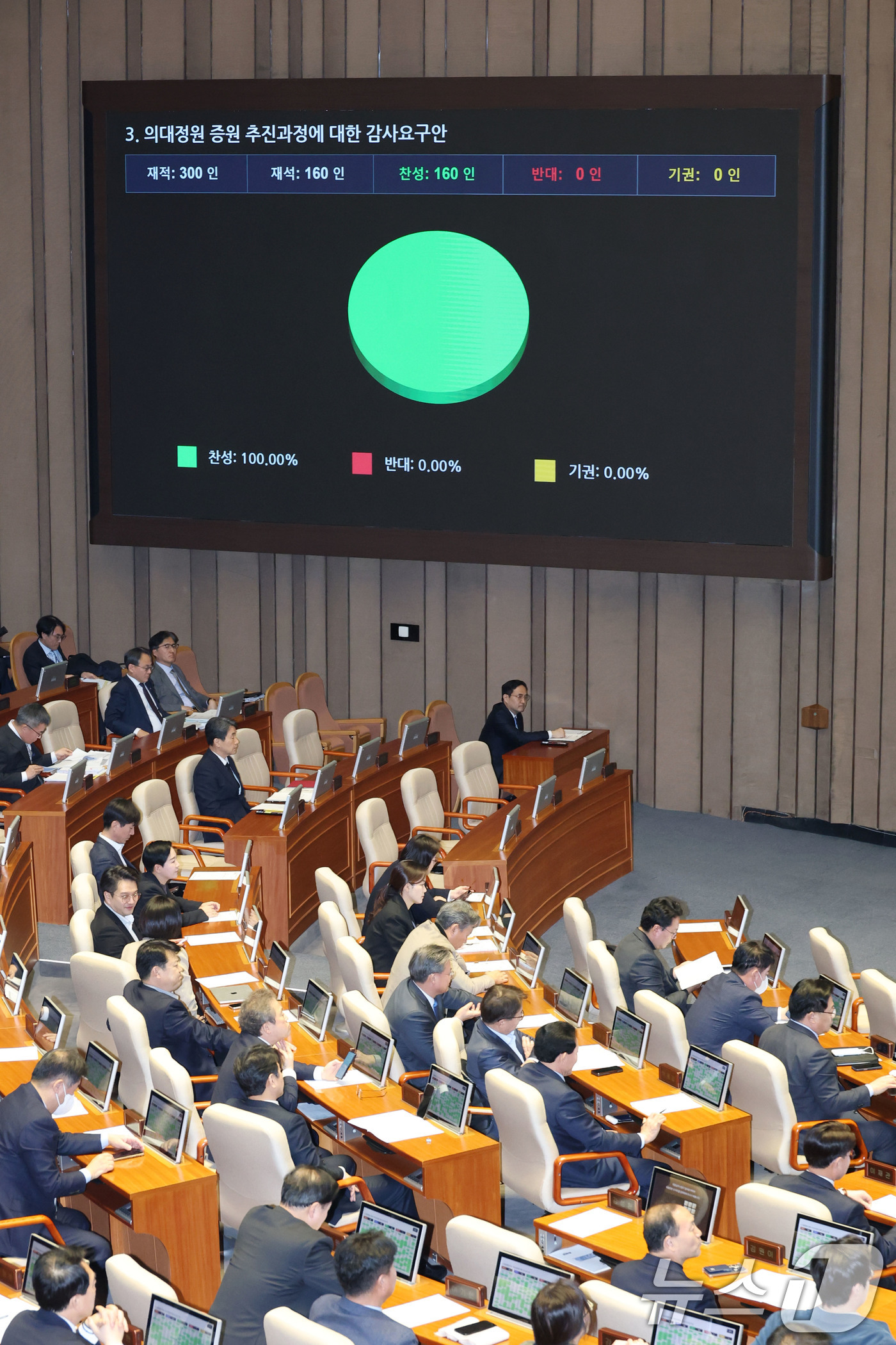 (서울=뉴스1) 이광호 기자 = 14일 오후 서울 여의도 국회에서 열린 본회의에서 의대정원 증원 추진과정에 대한 감사요구안이 재적 300인, 재석 160인, 찬성 160인, 반대 0인, 기권 0인으로 통과되고 있다. 2025.2.14/뉴스1