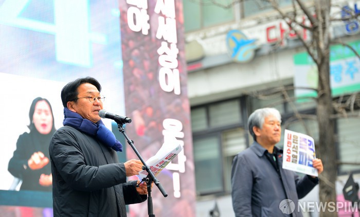 [광주=뉴스핌] 조은정 기자 = 강기정 광주시장이 15일 광주 동구 금남로에서 열린 광주비상행동 제14차 광주시민총궐기대회에서 발언을 하고 있다. 2025.02.15 ej7648@newspim.com