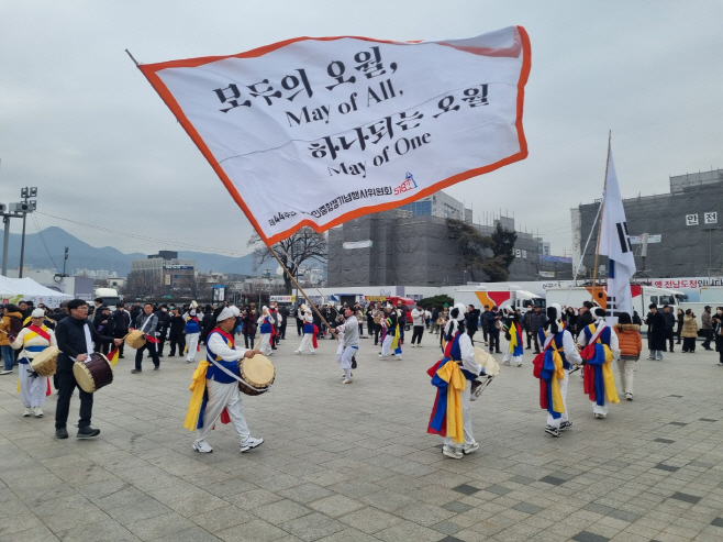 광주//아시아투데이 특별취재팀 기자 = 윤석열즉각퇴진·사회대개혁 광주비상행동(광주비상행동)은 15일 오후 광주 금남로 일대에서 14차 광주시민 총궐기대회를 진행했다. 궐기대회에 앞서 5·18민주광장에서 풍물단이 공연을 하고 있다.