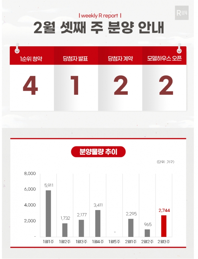 16일 부동산R114에 따르면 2월 셋째 주에는 전국 4개 단지 총 2744가구(일반분양 785가구)가 분양을 시작한다. 경기 고양시 도내동 '고양창릉A-4신혼희망타운(공공분양)', 경기 고양시 도내동 '고양창릉S-5,S-6(공공분양)', 대전 동구 가오동 '대전롯데캐슬더퍼스트' 등에서 청약을 진행한다. 견본주택은 대구 동구 신천동 'e편한세상동대구역센텀스퀘어', 충남 천안시 업성동 'e편한세상성성호수공원' 2곳이 문을 열 예정이다.