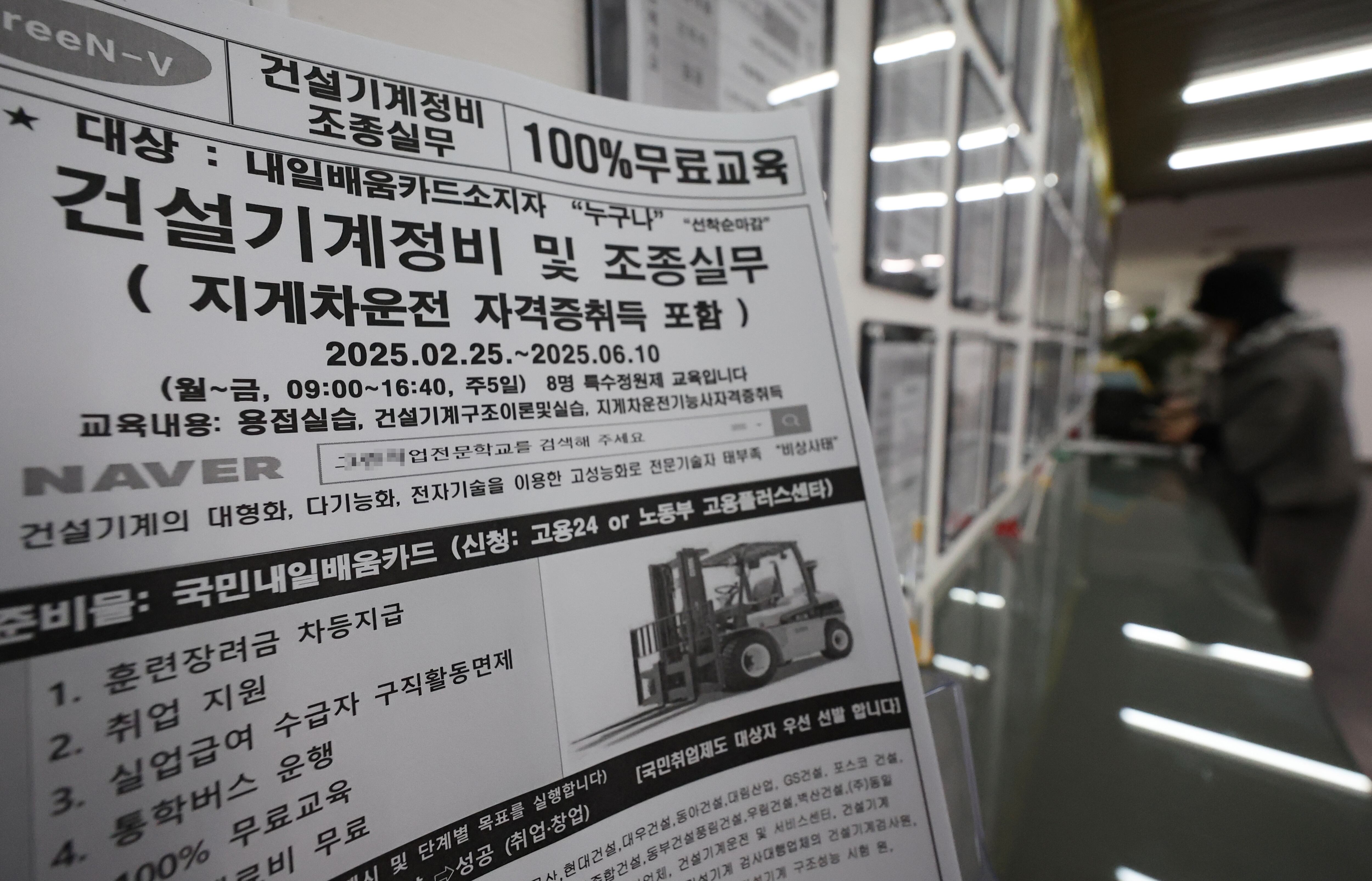 14일 서울 마포구 서울서부고용복지플러스센터 일자리정보 게시판 앞에 건설기계정비학원 안내문이 놓여 있다. /연합뉴스 |