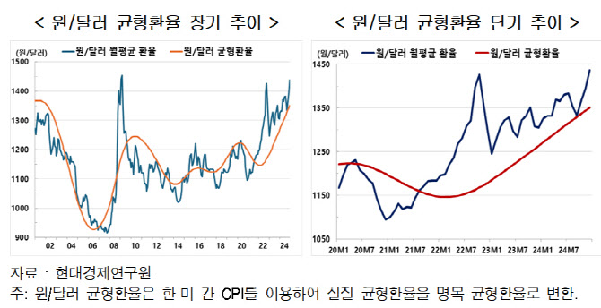 현경연이 현재의 경제 수준에서 적정한 통화가치를 나타내는 균형환율을 추정해 본 결과, 2024년 12월 균형환율은 1351원으로 실제 12월 평균환율 1437원보다 86원 낮은 것으로 확인됐다. 괴리율은 약 6% 수준으로, 현재 원화가 저평가 구간에 있다는 것으로 해석할 수 있다.