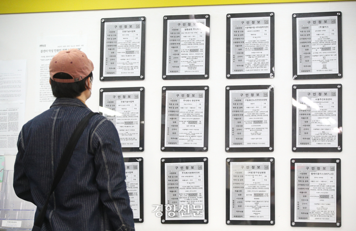 현행법상 1주 근로시간을 최대 52시간으로 제한하는 ‘근로기준법’이 합헌이라는 헌재의 판단이 나온 지난해 3월4일 서울 마포구 서울서부고용복지플러스센터에서 구직자들이 일자리정보 게시판을 살펴보고 있다. 성동훈 기자 |