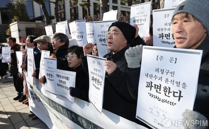 [서울=뉴스핌] 김학선 기자 = 참여연대가 17일 서울 종로구 헌법재판소 앞에서 윤석열 대통령 탄핵심판에 관한 의견서 제출 기자회견을 하고 있다. 2025.02.17 yooksa@newspim.com