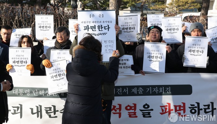 [서울=뉴스핌] 김학선 기자 = 참여연대가 17일 서울 종로구 헌법재판소 앞에서 열린 윤석열 대통령 탄핵심판에 관한 의견서 제출 기자회견에서 퍼포먼스를 하고 있다. 2025.02.17 yooksa@newspim.com