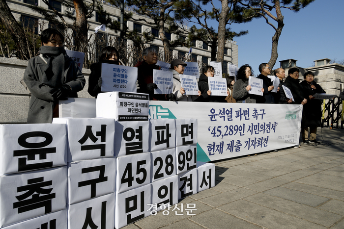윤석열 대통령의 파면을 촉구하는 4만5000여 명의 목소리가 헌법재판소로 향했다. 시민사회는 17일 “평범한 날 느닷없이 선포된 비상계엄은 헌법에 위반된다”며 윤 대통령의 탄핵을 바라는 이들의 연명을 담은 ‘시민 의견서’를 헌재에 제출했다.