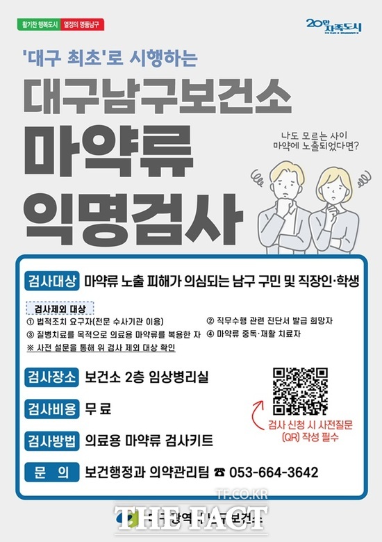[더팩트┃대구=박병선 기자] 대구 남구는 오는 24일부터 대구지역 최초로 '마약류 무료 익명검사'를 시행한다.