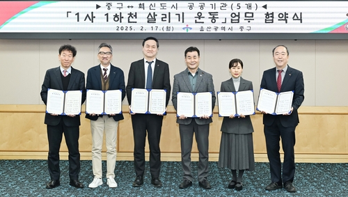 (울산=연합뉴스) 울산시 중구는 17일 구청에서 울산 혁신도시 공공기관과 '1사 1하천 살리기 운동' 추진을 위한 업무협약을 맺었다.