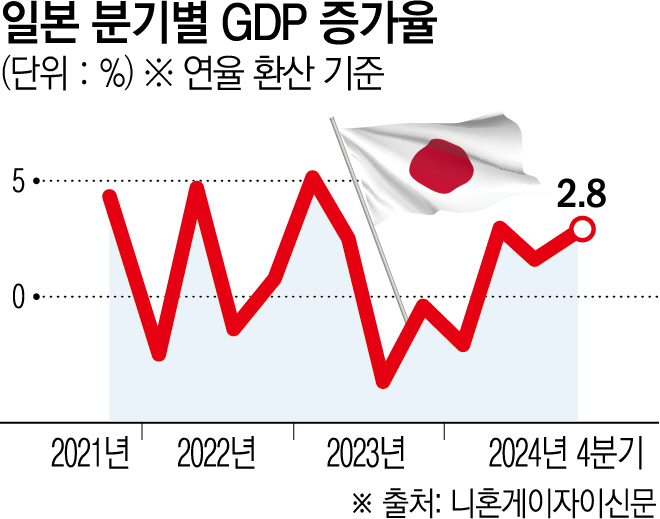 다만 지난해 연간 GDP는 실질(물가 변동 영향 제외) 기준으로 0.1% 증가해 4년 연속 플러스 성장을 유지했지만, 2020년 마이너스(-) 4.2% 이후 가장 낮은 수치를 기록했다. 2020년 역성장 후 일본은 2021년 2.7%, 2022년 0.9%, 2023년 1.5%의 추이를 보였다. 특히 2023년에는 외환위기 때인 1998년 이후 처음으로 한국(1.4%)을 앞섰으나 지난해 한국이 다시 역전했다. 한국은행이 최근 발표한 작년 실질 GDP 증가율(속보치)은 2.0%였다.
