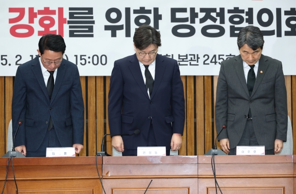 권성동 국민의힘 원내대표와 김상훈 정책위의장, 이주호 사회부총리 겸 교육부장관(왼쪽부터)이 17일 오후 서울 여의도 국회에서 열린 학교 안전 강화를 위한 당정협의회에서 대전 초등학생 피살 사건 희생자인 고 김하늘 양을 추모하는 묵념을 하고 있다. 2025.2.17/뉴스1 |