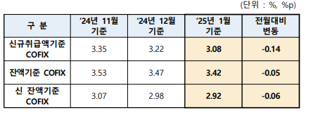 지난 1월 신규 취급액 기준 코픽스가 넉달째 하락하면서 3.08%를 기록했다. [은행연합회] |